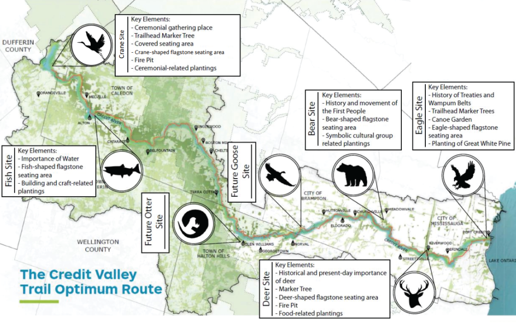 In 2019, the IRT, in partnership with CVC, finalized the Indigenous Experience Plan (IEP). This plan outlines a vision for the creation of seven key sites along the CVT, each representing an Anishinaabe doodem (clan) and serving as a focal point for storytelling, teachings and cultural engagement. These sites will feature interpretive signage, public art installations and gathering spaces designed to foster understanding and appreciation of Indigenous heritage and culture.